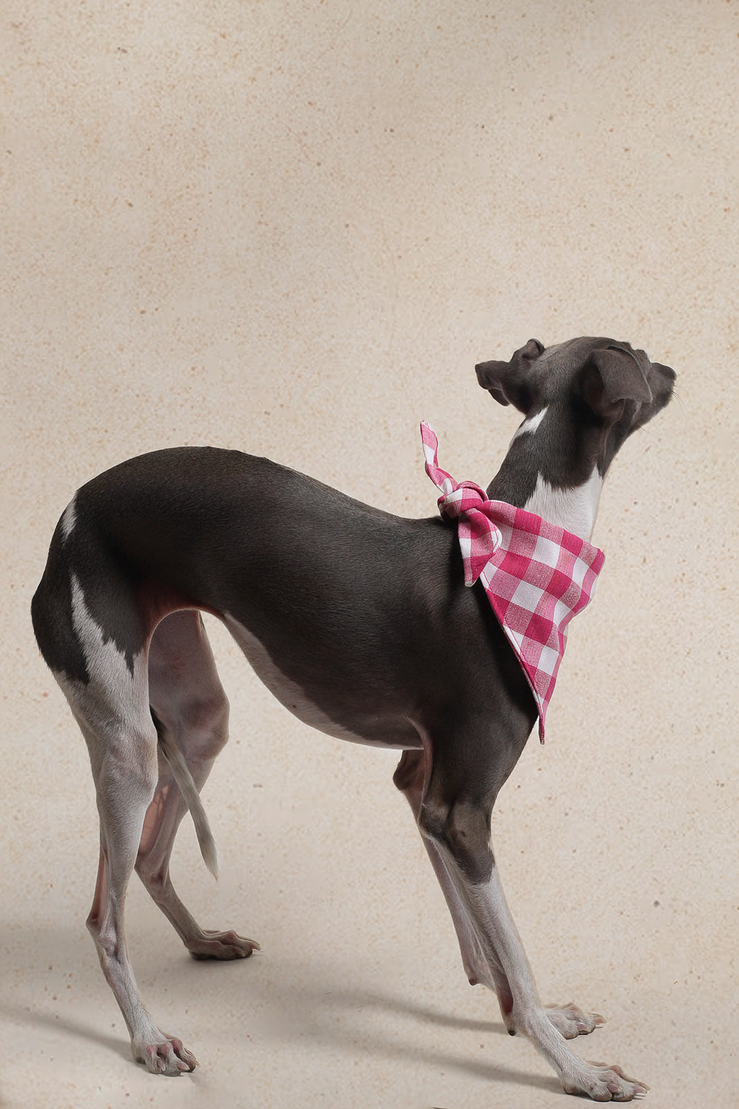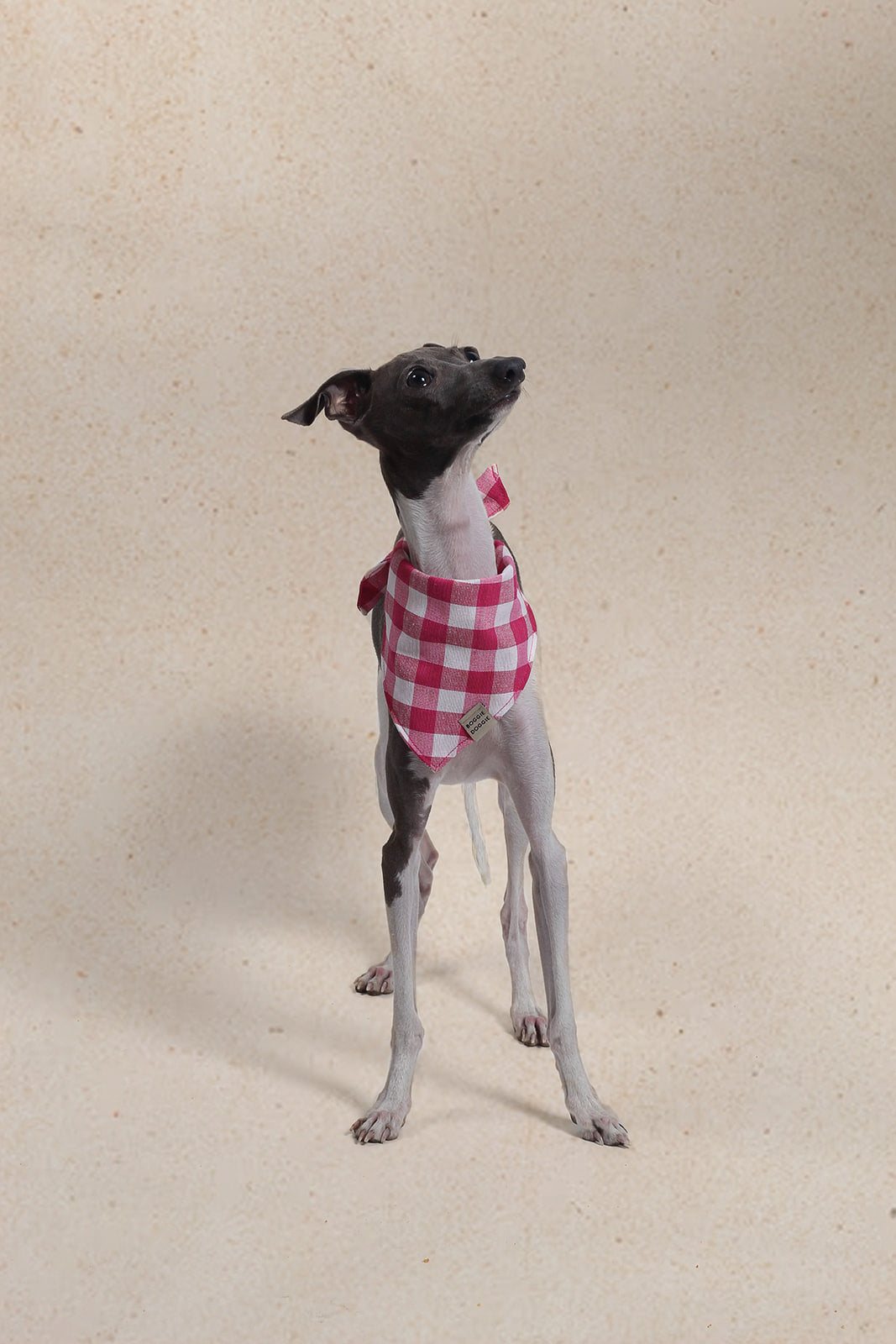 Bandana vibrante con diseño de cuadros vichy medianos en tonos rosa intenso y blanco ¡perfecta para darle un toque alegre y coqueto a tu mascota!