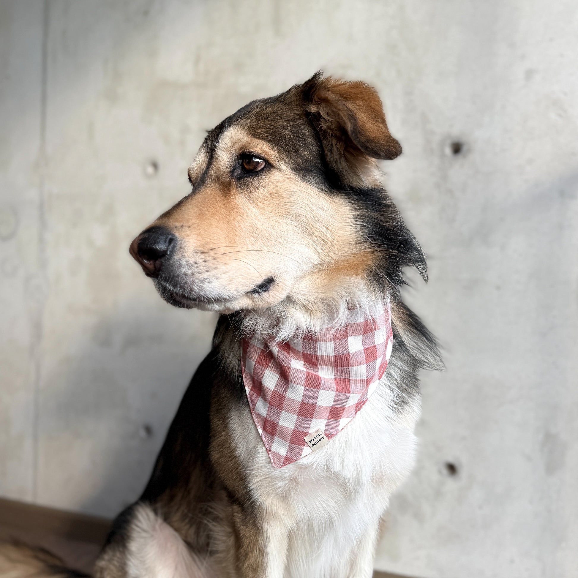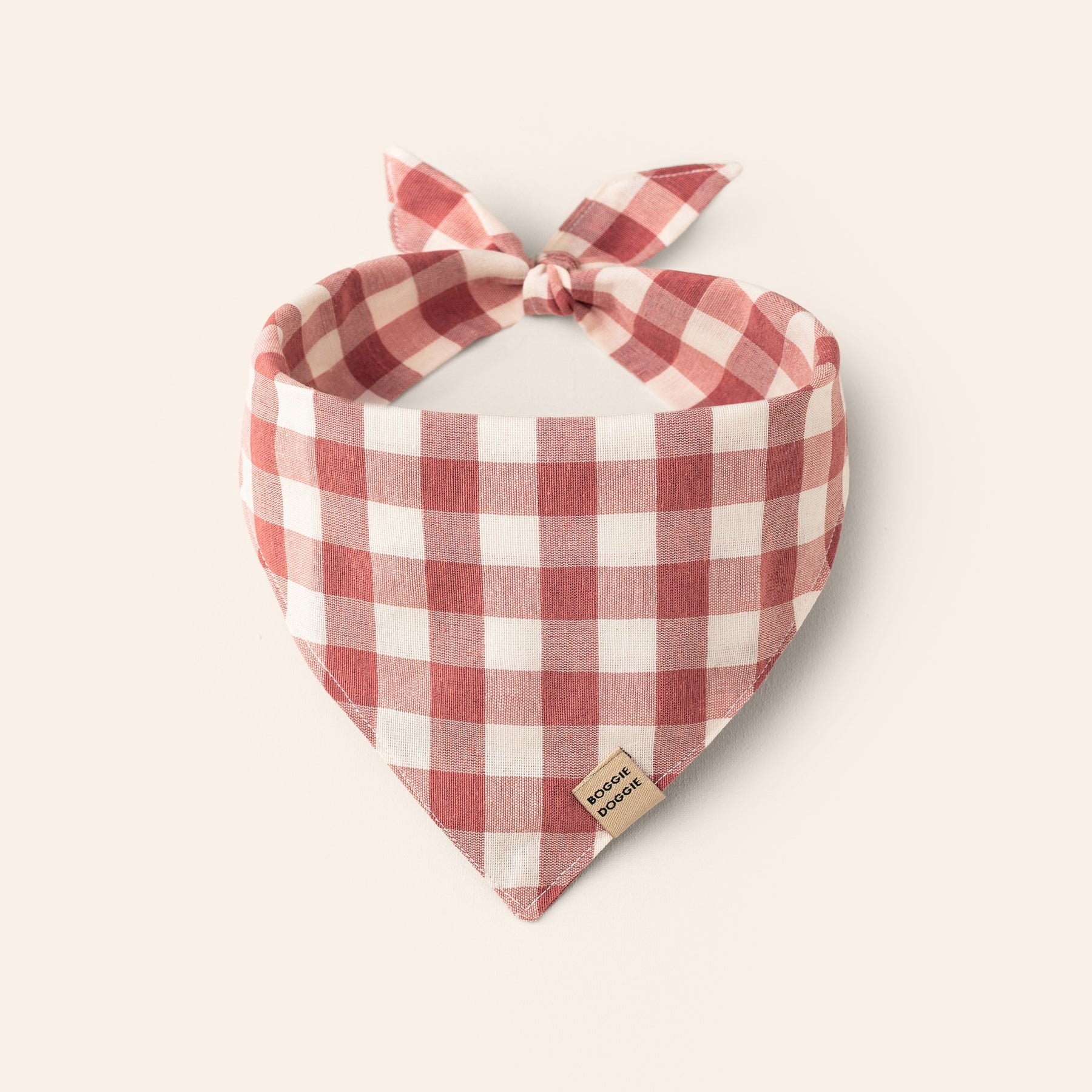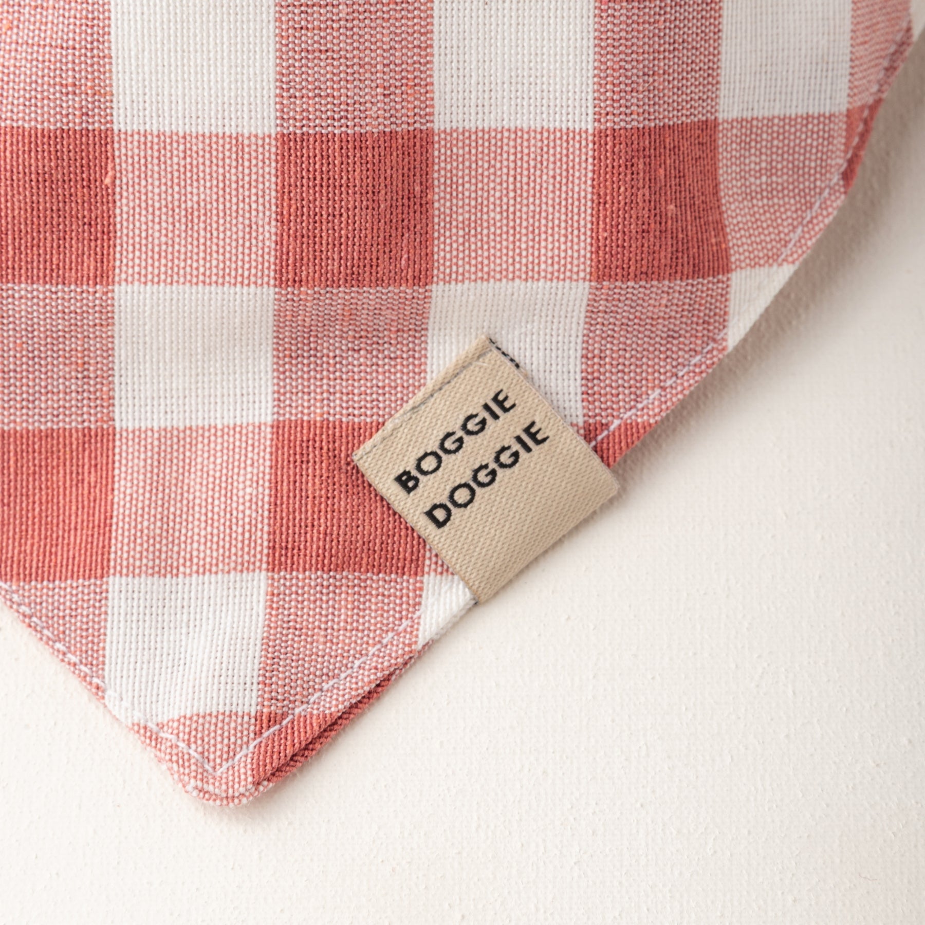 Esta bandana tiene un diseño de cuadros vichy medianos en tonos coral y blanco.