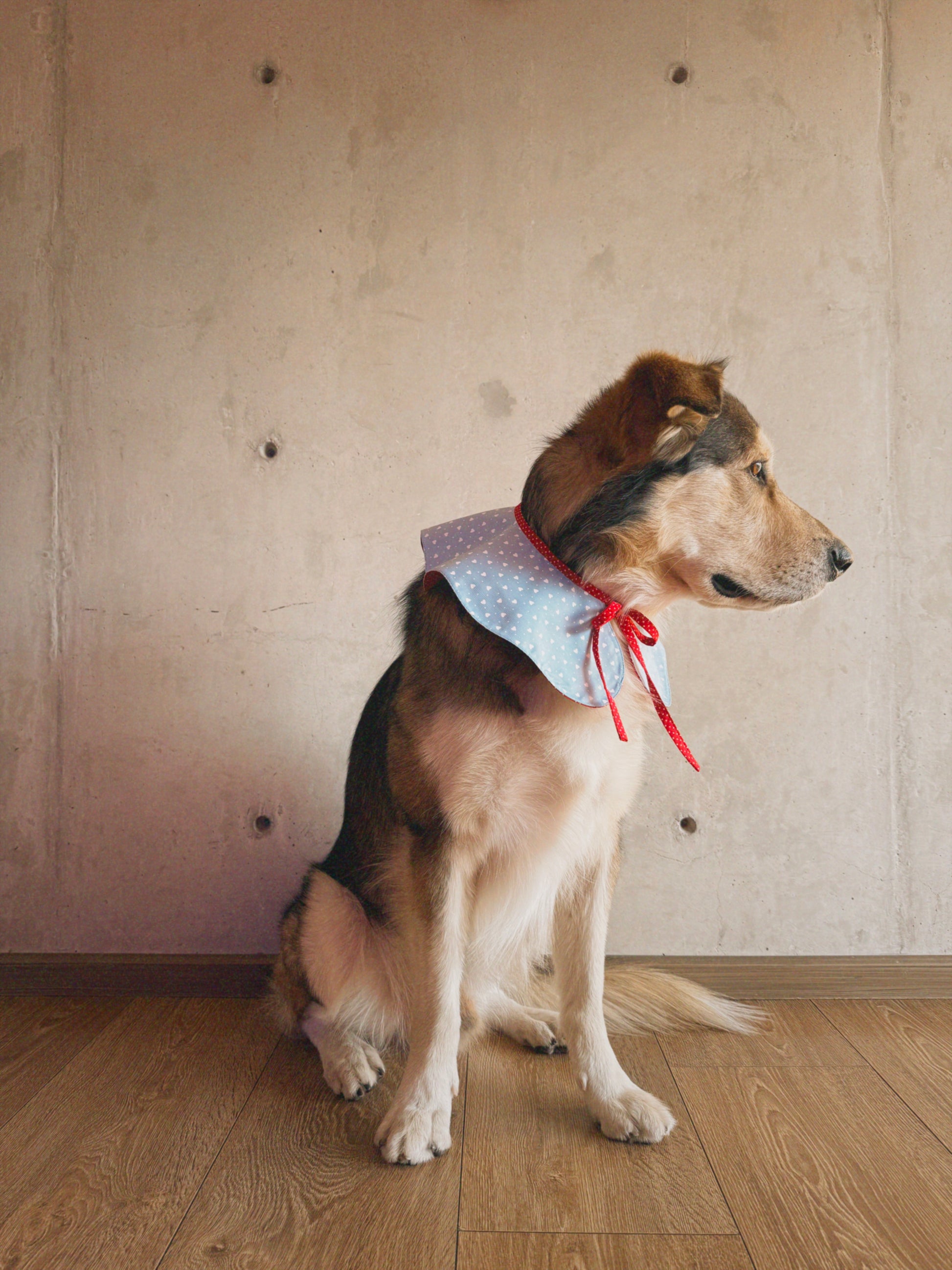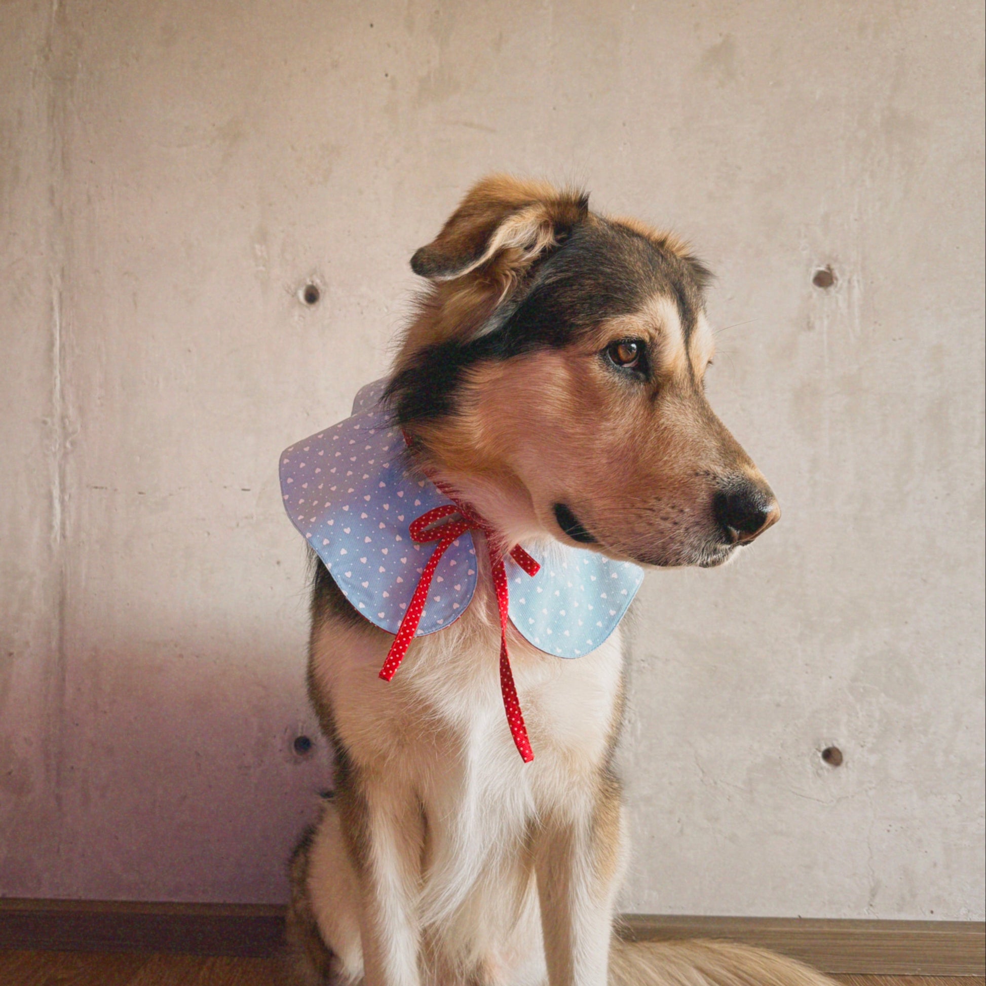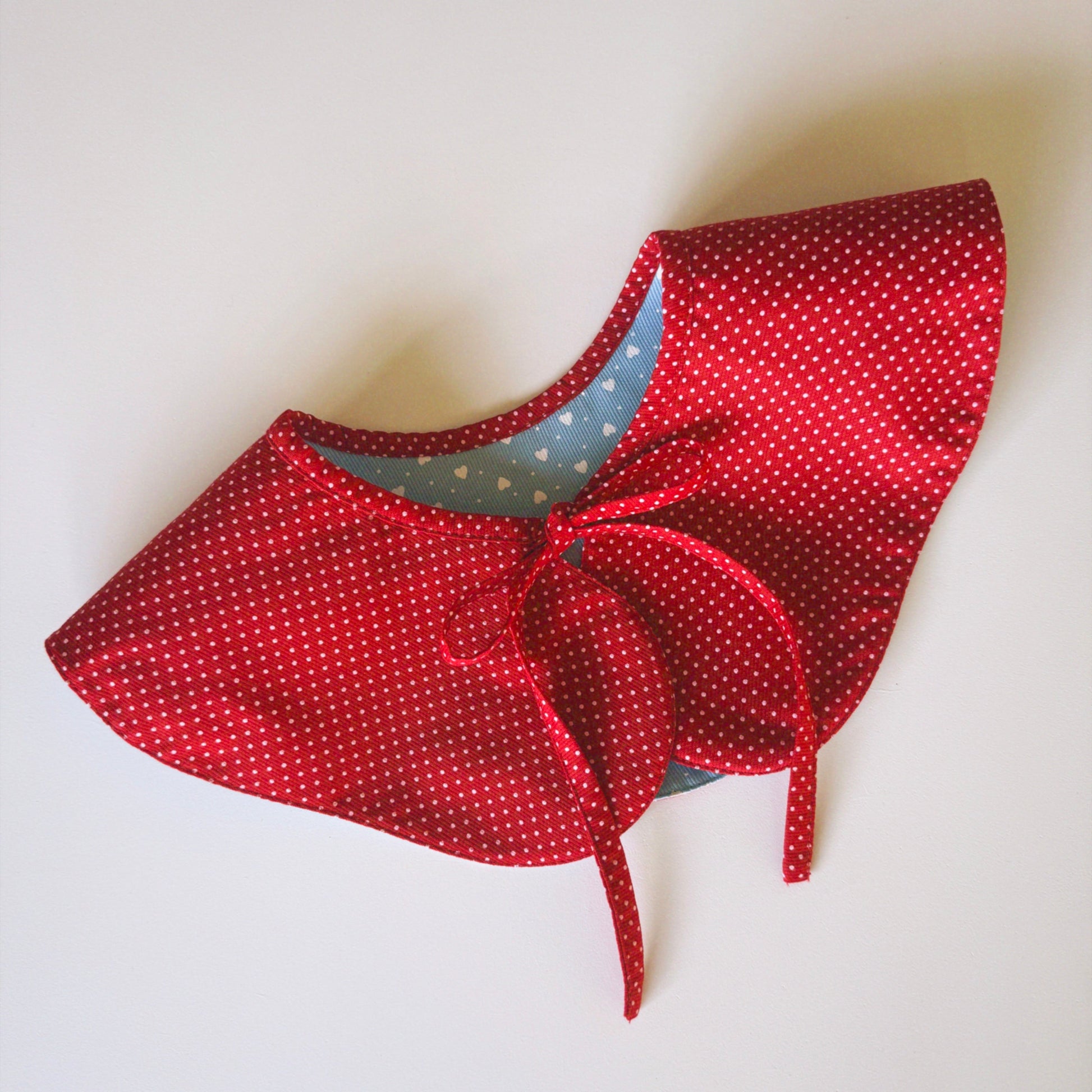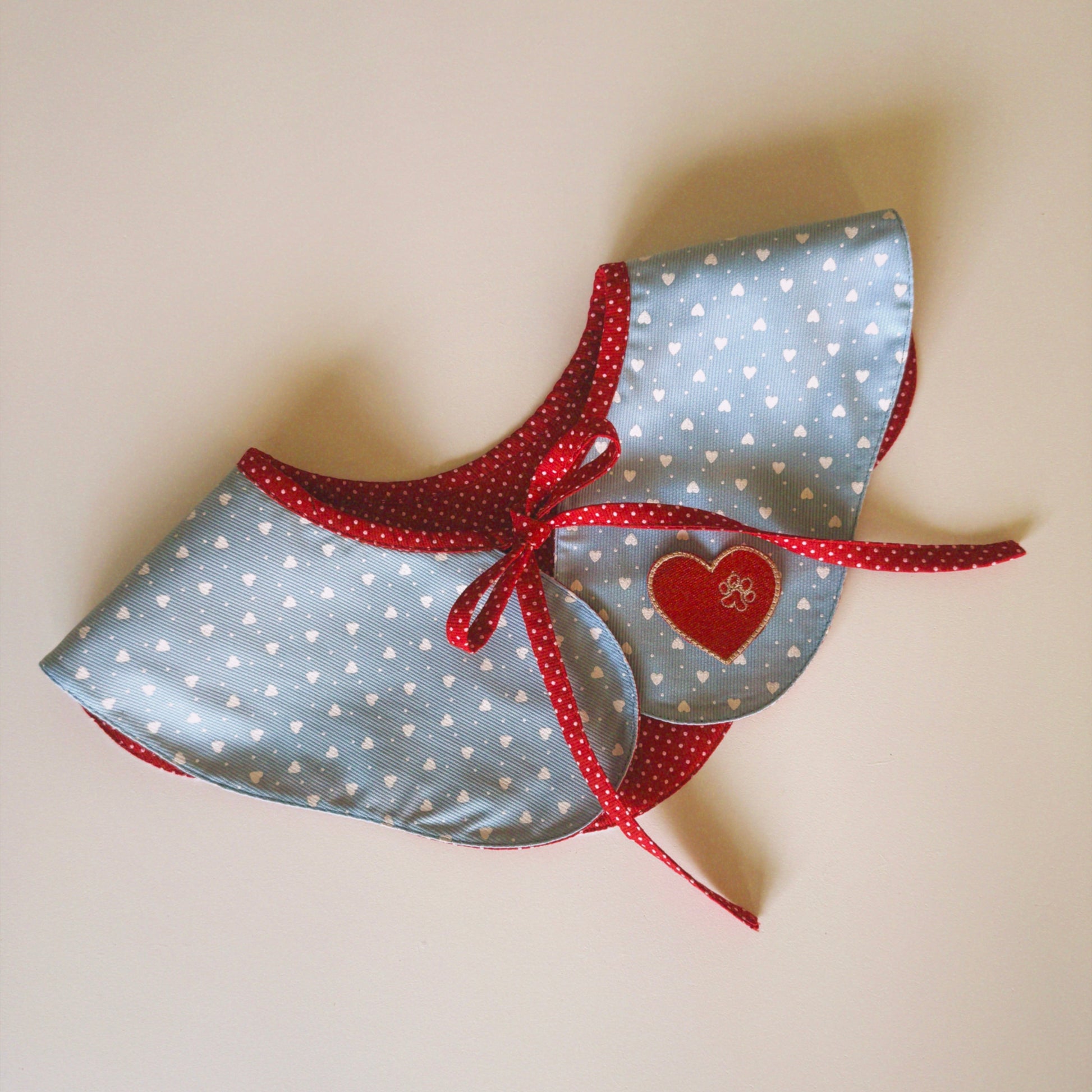 Cuello inspirado en los cuellos vintage, para darle un toque tierno y romántico a nuestros perros y gatitos. Es doble vista, de un lado es azul con corazones blancos y el otro es rojo con lunares blancos, lleva un bies de la misma tela con el que se amarra fácilmente.